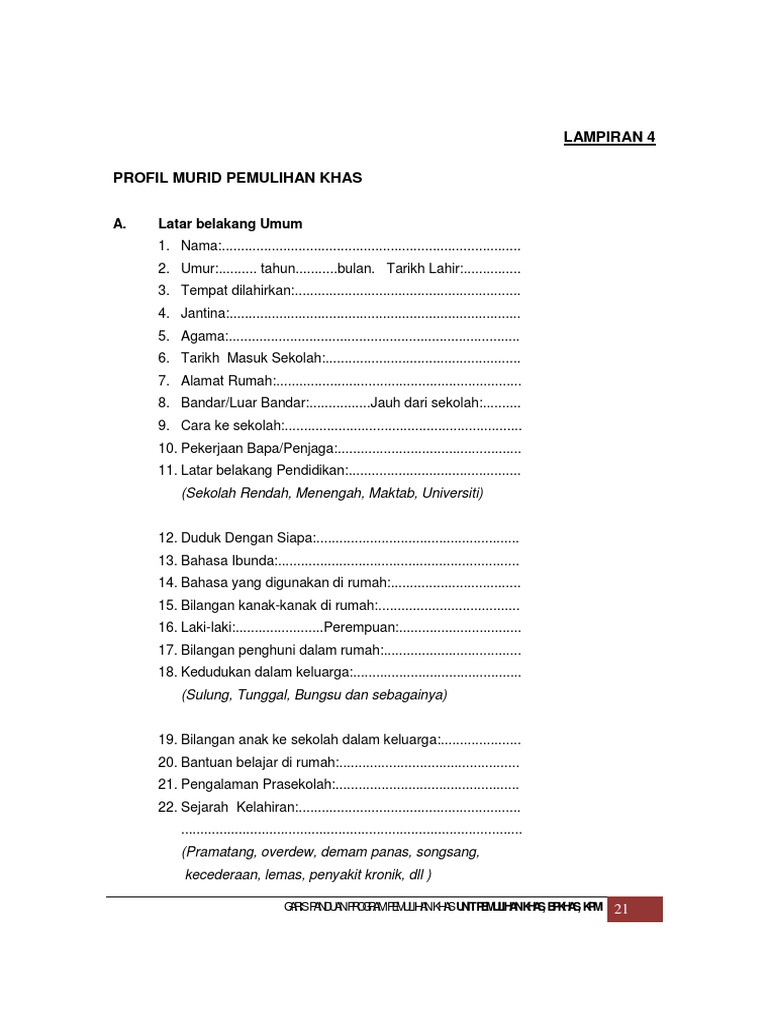 Program Pemulihan Khas Outreach Borang Pendidikan Khas Kategori Pendidikan Khas Sindrom Down Autisme Lewat Perkembangan Global Kurang Upaya Intelektual Adhd Masalah Pembelajaran Pdf Document from reader018.staticloud.net Fadzil hanid 6 months ago. Pusat bandar chini, 26690 chini,pahang darul makmur. Maklumat pelajar pra sekolah tidak perlu didaftar masuk di apdm. Borang maklumat murid modul pengurusan murid, sistem pengurusan pengurusan sekola h kementerian pendidikan malaysia a. Borang maklumat murid (download pdf). Borang kosong ini boleh di download dengan klik download borang apdm murid. Guru pemulihan khas hendaklah mengajar murid linus tegar tidak melebihi 15 orang pada setiap sesi pembelajaran selepas saringan 2 dilaksanakan. Sila isikan maklumat pendidikan tuan / puan pada ruangan dalam jadual di bawah.