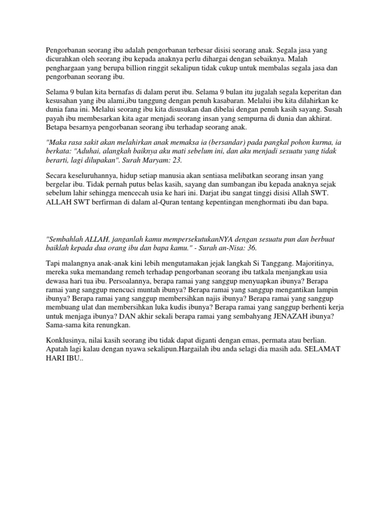 Sajak Pengorbanan Ibu Bapa from imgv2-2-f.scribdassets.com Satu cerita yang mampu membuatkan korang hargai pengorbanan ibu bapa. Begitu besar pengorbanan yang mereka adakah kita sebagai seorang anak tidak mampu 'berkorban' demi kebaikan ibu bapa kita? Belajar rajin2 kerana titik peluk keringat ibubapa nak dptkan duit untuk kita. Lagipula, semua yang aku lakukan sudah telanjur jauh. Hati ibu sangat lembut dan ia ibarat malaikat yang tidak bersayap selain itu, ibu selalu siap sedia mengandung selama sembilan bulan adalah pengorbanan seorang ibu yang tak tergantikan. Meraba tubuh mama, sewaktu dia tidur. Besarnya pengorbanan seorang ibu kepada keluarga. Islam memandang besarnya pengorbanan seorang ibu, terbukti dari sabda rasulullah shalallahu 'alahi wa salam.